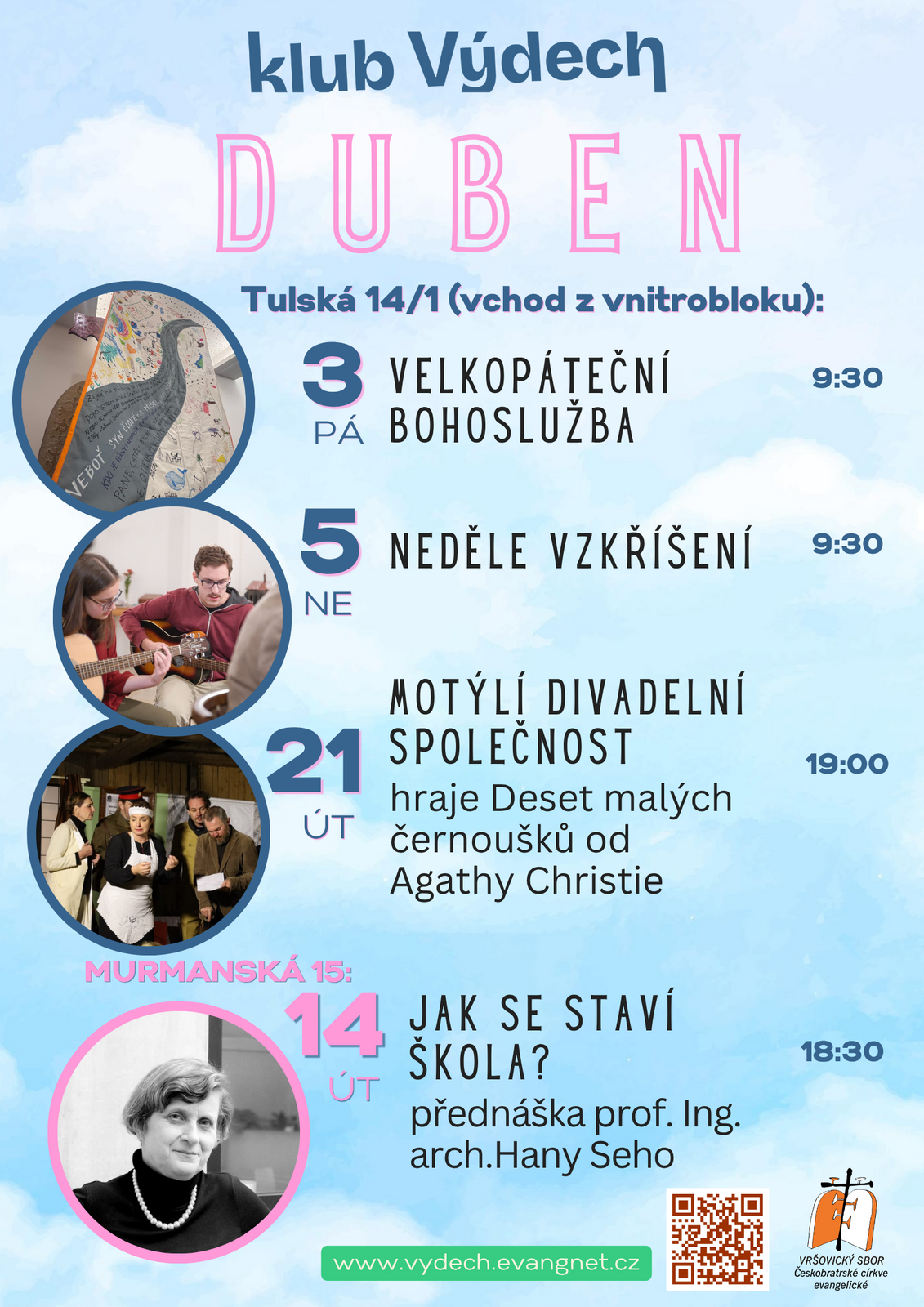 Divadlo, přednáška o architektuře, bohoslužby a Velikonoce. Vidíme se?