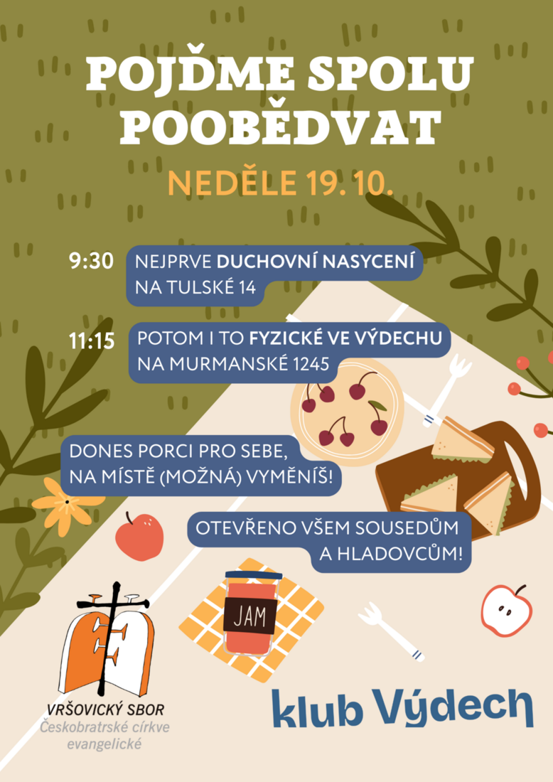 Co takhle spolu v neděli 19.10. poobědvat a uspořádat malý happening u našeho Výdechu? Láska i vztahy přeci prochází žaludkem. Nejprve se dočkáme občerstvení duchovního na bohoslužbách (Tulská 14) a následně se navzájem nasytíme i fyzicky v Klubu Výdech. Pár porcí by nám mohli uvařit mládežníci na chystané víkendovce, ale to hlavní bychom si donesli sami a vyměnili mezi sebou, kdo má na co zrovna chuť. Pochlubte se svými kulinářskými dovednostmi, pozvěte své přátele (a nepřátelům zkuste nenápadně do talíře vmíchat projímadlo) - a třeba zbude i na náhodné vršovické kolemjdoucí! A kdo udělá jídlo dle nějakého receptu z našich Katakomb, může si další neděli vybrat píseň v rámci bohoslužeb!